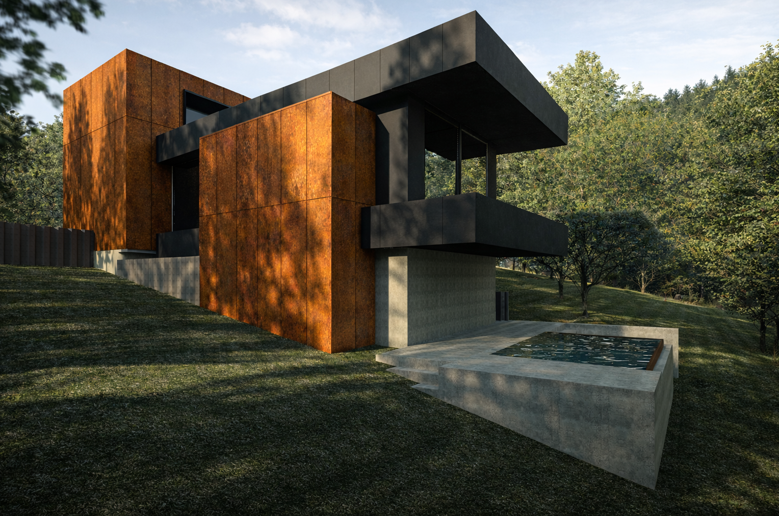 The weathering steel volumes act as sculptural elements—designed to evolve over time and integrate with the surrounding landscape.