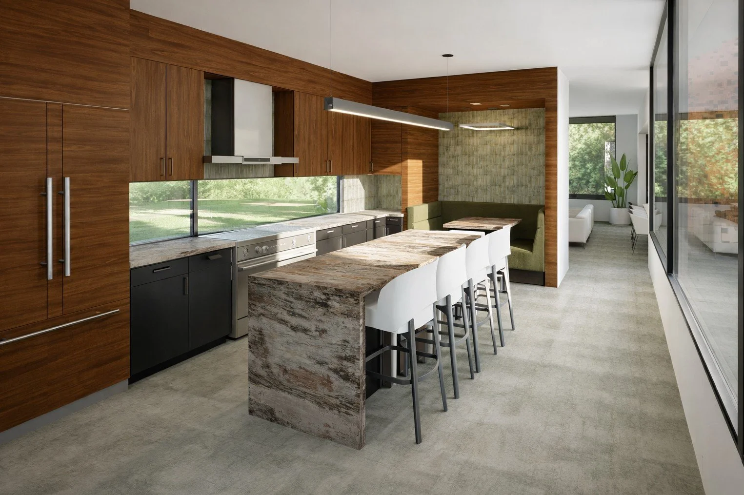 Open-plan kitchen, dining, and living area